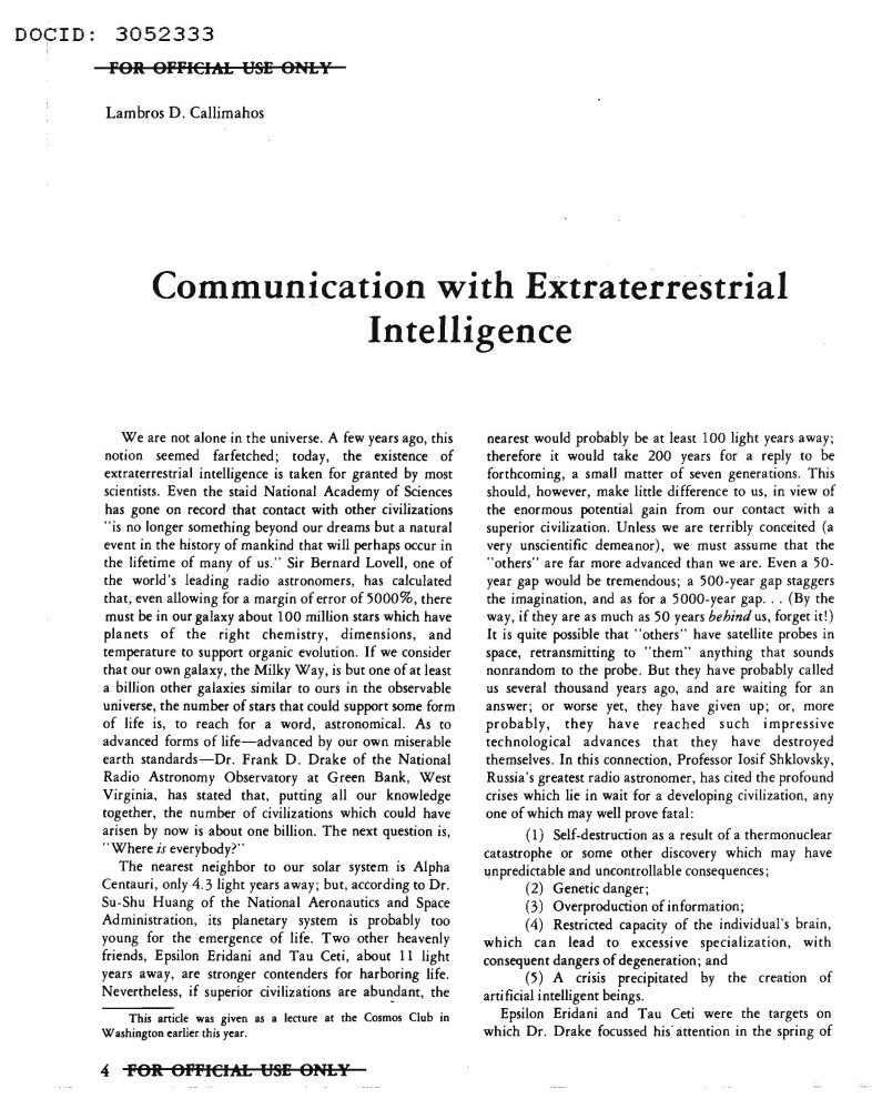 下面是对这篇 NSA 解密文档 《Communication with Extraterrestrial Intelligence》(与地外智慧沟通) 的详细解读和总结: